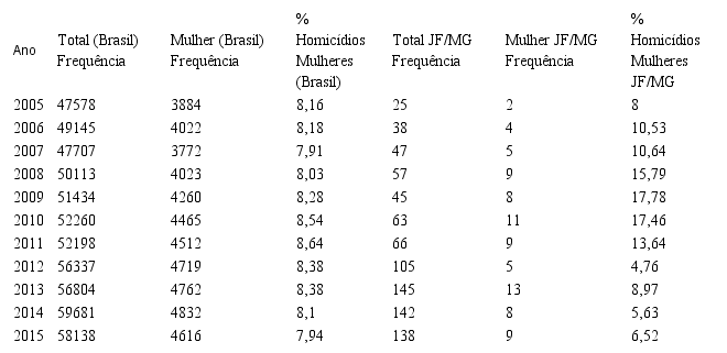 A série de história de mortes por agressão contra mulheres na cidade de Juiz de Fora, também de acordo com os dados obtidos através do Sistema DataSus, evidencia que, com exceção dos números de 2008, 2009 e 2010, tal índice vem se mantendo dentro de um nível regular quando comparado com a média nacional. Importante salientar que embora nem todo homicídio contra mulher possa ser tipificado como feminicídio - qualificadora esta que se caracteriza quando o homicídio é praticado contra a mulher por razões da condição do sexo feminino - todos os números abaixo apresentados são anteriores à entrada em vigor da Lei 13104 de 09 de março de 2015, pelo que não é possível relacionar o possível impacto de tal legislação com os números de crimes contra as mulheres.