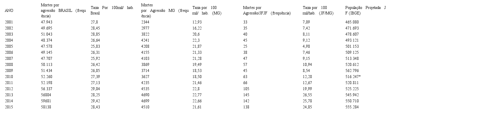 A coleta dos dados acima, no sistema Datasus, foi realizada utilizando o seguinte critério: óbitos por causas externas, grande grupo CID 10 (mortes causadas por agressões), tendo como referencial o local de ocorrência. Assim, foram sistematizados os números de óbitos por agressão no Brasil, Minas Gerais e Juiz de Fora, dentro de um mesmo período (2001 até 2014). Algumas ressalvas metodológicas são importantes: 1) a utilização dos dados do Datasus visa, principalmente, a partir de uma única base de dados, viabilizar a comparação a dos números apresentados; 2) Morte por agressão é uma categoria utilizada pelo sistema de saúde, ou seja, não é uma categoria jurídica. Desta forma, os números de morte por agressão incluem as seguintes categorias jurídicas: homicídio doloso, latrocínio e lesão corporal seguida de morte (todos crimes violentos); 3) Na categoria “morte por agressão” estão excluídas mortes causadas não intencionalmente, mortes naturais, mortes causadas por acidentes e autoextermínio; 4) A análise a partir de tais dados é a mais adequada para a pesquisa pretendida: identificação do perfil das vítimas através das seguintes categorias: sexo, idade, local da ocorrência do óbito e arma utilizada na agressão.