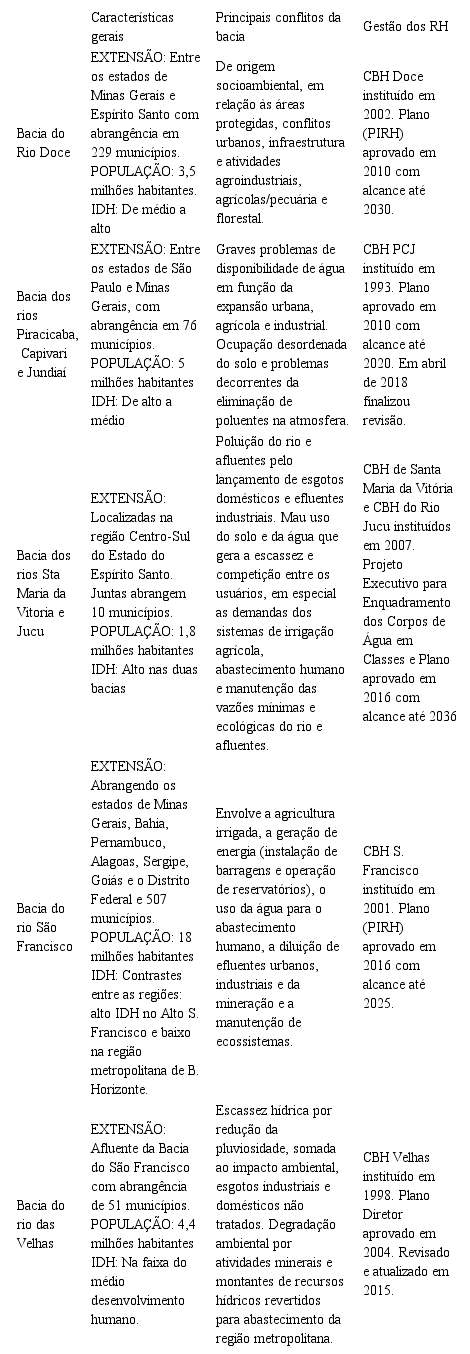 Para testagem da QUADEPLARH foram escolhidos cinco PRHs já elaborados: das bacias dos rios: Doce; Piracicaba, Capivari e Jundiaí (PCJ); Santa Maria e Jucu; São Francisco e Velhas. Este recorte foi feito com base nos seguintes critérios: temporalidade (a partir de 2010), dominialidades dos rios (estadual da União), empresas de consultoria (presumindo abordagens metodológicas distintas) e acessibilidade dos dados. Em relação à obtenção de dados, realizou-se uma pesquisa documental cujo material base foram planos aprovados, termos de referência (TRs), planos de trabalho, relatórios parciais e finais referentes aos cinco planejamentos selecionados. Para a coleta de dados também foram consultados os sítios dos comitês e da Agência Nacional de Águas. De maneira complementar, recorremos aos mecanismos de busca com as palavras chave: planos de bacia, participação pública, participação ativa, consulta pública, reuniões públicas. Os levantamentos na Internet foram realizados entre novembro de 2017 a janeiro de 2018. Apresentamos, em seguida, uma breve descrição das regiões hidrográficas destacadas e seus respectivos CBHs e planos3.