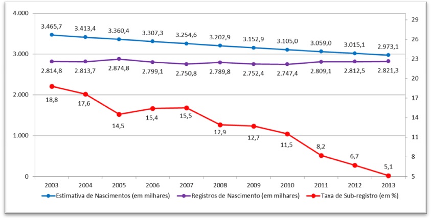 Nos anos seguintes, cujos dados foram analisados a partir dos registros oficiais dos cartórios e das PNADs, houve diminuição considerável no sub-registro de nascimento no país. A título de exemplo, o ano de 2013 indicava queda significativa do sub-registro civil de nascimento no país. Segundo os dados do governo, o sub-registro total em 2003 era de 18,8% e 10 anos depois, em 2013, o sub-registro permanecia em 5,1% em território brasileiro (Gráfico 1).
