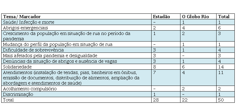 No Estadão encontramos 28 reportagens que traziam a relação entre população em situação de rua e a pandemia; e, no Globo Rio, foram 22. Segue um quadro com o número de notícias sobre alguns temas em cada um desses veículos[5].