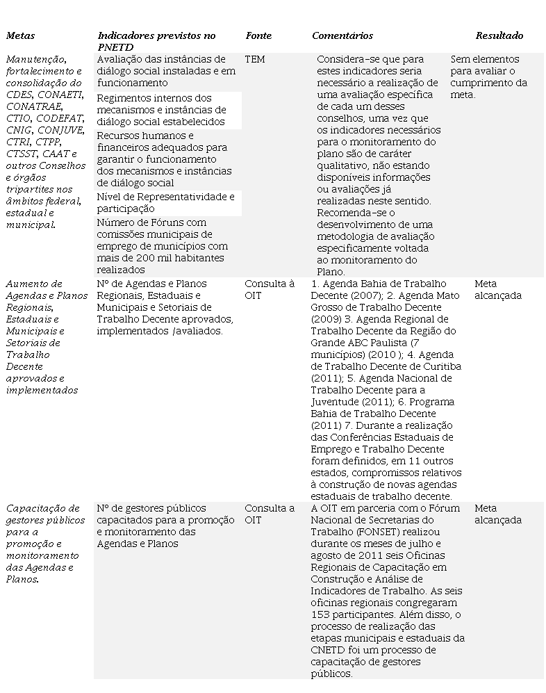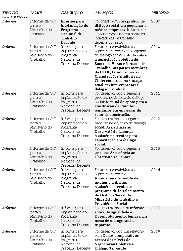O quadro abaixo apresenta o relatório de monitoramento do PNTD elaborado pela OIT; o documento realiza a análise dos avanços na promoção do diálogo social.