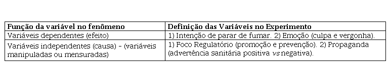 Para verificar a influência das advertências sanitárias com apelo ao medo e das advertências sanitárias positivas na intenção de parar de fumar e na emoção (culpa e vergonha) dos fumantes, o experimento desenvolvido adotou o desenho fatorial com formato 2x2, sendo duas advertências sanitárias (advertência sanitária de apelo ao medo versus advertência sanitária positiva) e dois focos regulatórios (promocional versus preventivo).