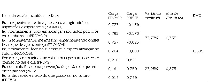 As variáveis foram testadas com o fim de verificar a sua dimensionalidade. Em seguida, realizou-se a análise fatorial exploratória da escala de Foco Regulatório, a qual, após a eliminação das assertivas PROMO3; PREV1 e PREV4, por terem demonstrado baixas comunalidades (<0,50), foi definida em dois fatores e se mostrou adequada. O primeiro fator, com variância explicada de 33,73%, agrupou os indicadores de mensuração do perfil promocional (PROMO) e o segundo fator, com explicação de 27,25%, agrupou os indicadores para estimação do perfil preventivo (PREVE). O coeficiente alfa de Cronbach também se mostrou adequado para os dois fatores (>0,70), conforme exposto na Tabela 1.
