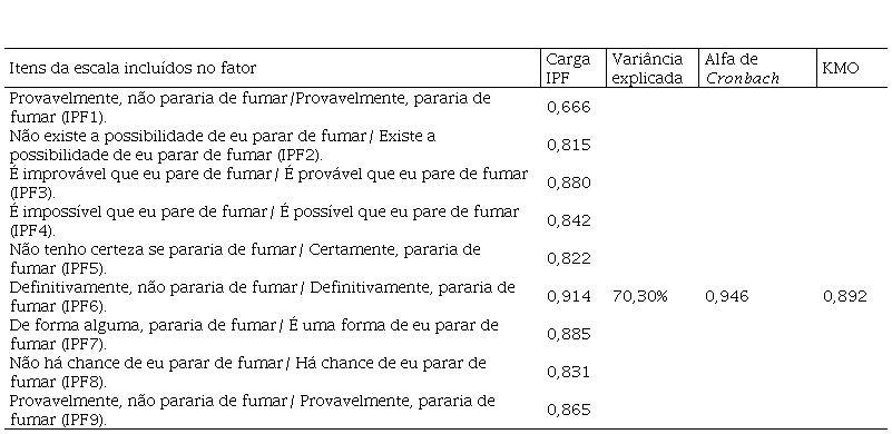 O procedimento também foi realizado para a variável dependente intenção de parar de fumar (IPF) por meio da agregação das nove afirmativas (α= 0,946). O KMO foi 0,892 e a porcentagem da variância explicada pelo fator foi de 70,30%, conforme pode ser visto na Tabela 2.