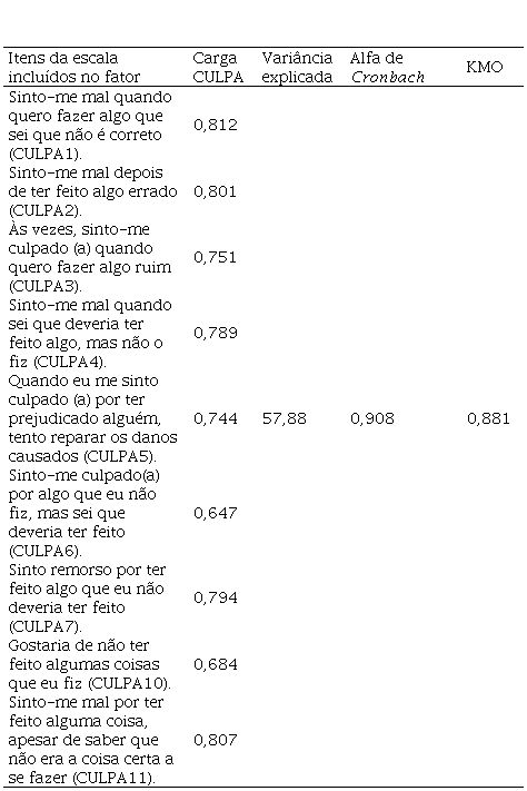 Destaca-se que a variável dependente ‘emoção-culpa’ também foi submetida à análise fatorial, cujos resultados são apresentados na Tabela 3. Em relação a essa variável, agregaram-se ao fator nove das onze assertivas que compunham o modelo, excetuando-se as assertivas CULPA8 e CULPA9 (α= 0,908). O KMO foi 0,881, sendo 57,88% a variância explicada pelo fator.