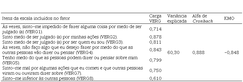 Em relação à variável dependente ‘emoção-vergonha’, foram agregadas ao fator sete das oito assertivas que compunham o modelo, visto que a assertiva VERG6 não aderiu ao fator, sendo α= 0,888. O KMO foi 0,848 e a porcentagem da variância explicada foi de 60,30%, como sintetizado na Tabela 4.