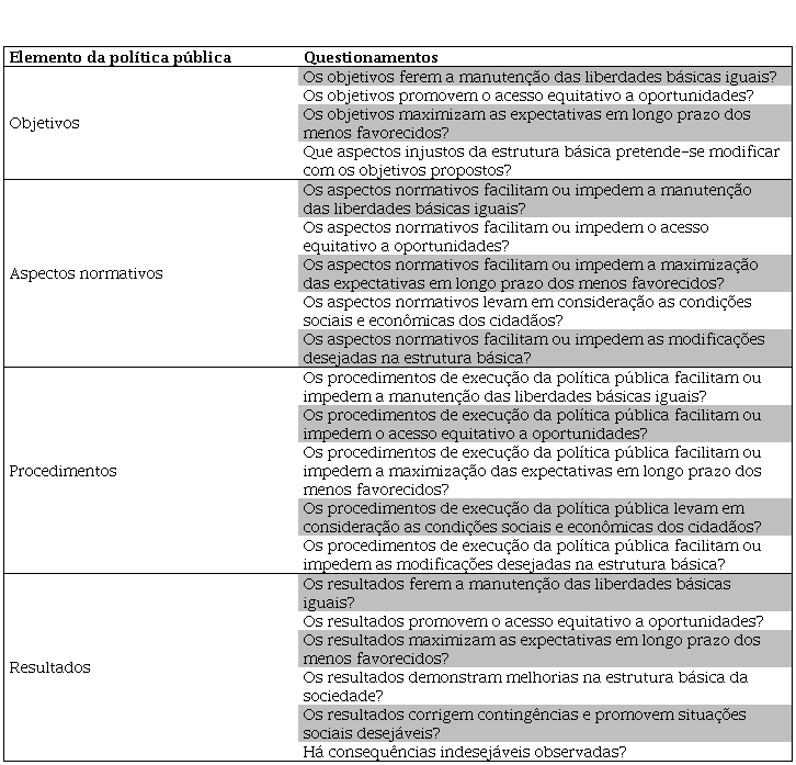 Nessa avaliação, uma serie de questionamentos devem ser realizados, tendo como referência os princípios da justiça como equidade e uma multiplicidade de fatos sociais e econômicos que caracterizam a estrutura básica da sociedade. O Quadro 1 apresenta alguns questionamentos possíveis.