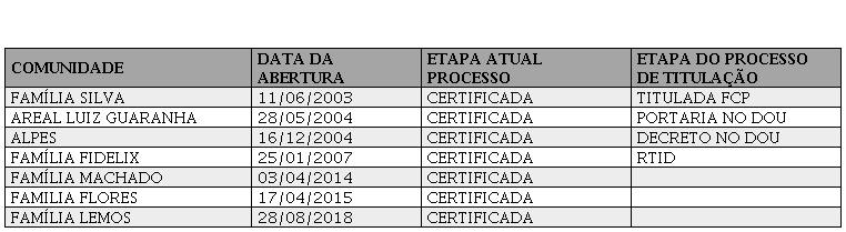 Em 1995, sete anos após a promulgação da Constituição Federal, a Comunidade Boa Vista (PA) no Alto Trombetas, no município de Oriximiná, foi o primeiro quilombo brasileiro a ser reconhecido. Todavia, o não reconhecimento das populações remanescentes e a garantia constitucional desse direito ainda é uma realidade. Segundo a fundação Palmares, desde 1995, mais de 2800 comunidades foram reconhecidas, o que não significa que todas possuem certidão de titulação, essa que hoje cabe ao Incra sancionar.