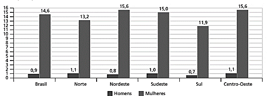Para Pinheiro et al., (2019), no ano de 2018, 14,6% das mulheres brasileiras ocupadas concentravam-se em atividades remuneradas no trabalho doméstico. Estamos falando de um contingente de mais de 5,7 milhões de mulheres que compõem a maior categoria ocupacional ainda aberta para as trabalhadoras. Ainda segundo as autoras, as regiões Sul e Norte estão abaixo da média nacional – com 12% e 13%, respectivamente, de mulheres ocupadas no trabalho doméstico –, Nordeste, Sudeste e Centro-Oeste mantêm-se acima da média, chegando a uma proporção de quase 16% das mulheres neste último caso. O trabalho doméstico remunerado para os homens, por sua vez, não responde nem por 1% dos ocupados, como é mostrado no gráfico abaixo (IBIDEM, 2019, p.11).