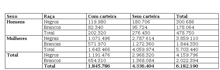 No contexto de pandemia da COVID-19, a intensificação da exploração e da vulnerabilidade do trabalho doméstico se tencionam com o cenário atual de desmontes dos direitos trabalhistas e sociais, onde a maior parte destas trabalhadoras se encontram inseridas no nível de informalidade – ou seja, “sem acesso a benefícios como seguro-desemprego e auxílio-doença” (PINHEIRO et al, 2020). Assim, conforme a tabela abaixo, demonstra que a maior parte das trabalhadoras(es) domésticas(es) que exercem o trabalho sem carteira assinada são mulheres negras: o dobro em relação a homens negros e mulheres brancas.