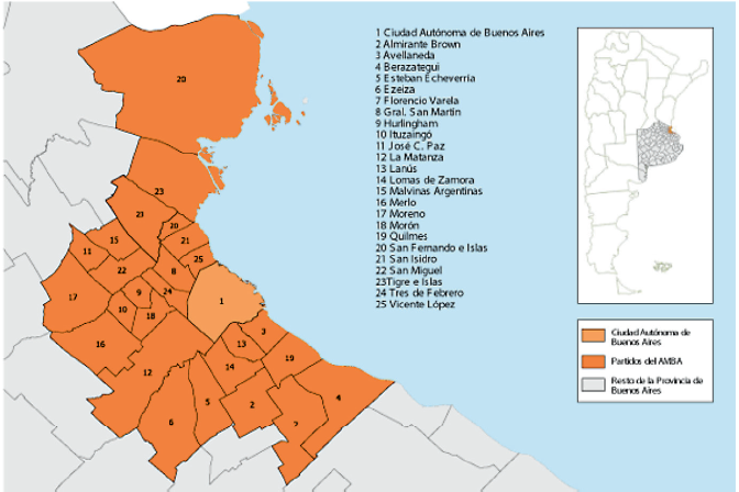 El presente trabajo[1] busca examinar los impactos recientes del COVID-19 sobre el entramado productivo argentino y los principales instrumentos de apoyo desarrollados, en particular en los municipios del Área Metropolitana de Buenos Aires (AMBA). El análisis contempla desde la instrumentación del Aislamiento Social, Preventivo y Obligatorio (ASPO) a comienzos de la pandemia, hasta las nuevas medidas de Distanciamiento Social, Preventivo y Obligatorio (DISPO)[2].El territorio a considerar comprende los 24 municipios/partidos del Gran Buenos Aires, que rodean a la Ciudad Autónoma de Buenos Aires, y junto con esta última aportan casi la mitad de la riqueza del país.