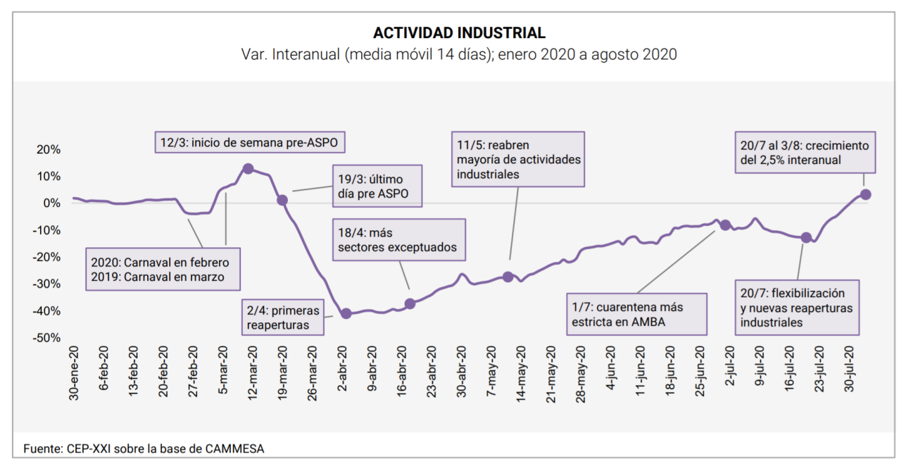 Según lo referenciado por los funcionarios, luego de una primera etapa de la cuarentena con un funcionamiento sólo de un tercio de las empresas, vinculadas a actividades esenciales o ligadas, se pasó desde julio en adelante a la apertura de más de las dos terceras partes de las industrias (no de manera completa, con protocolos y en diferentes turnos) y en la actualidad el que pudo abrir sus puertas ya lo hizo. Además, de la fuerte caída de ventas en gran parte de las firmas al inicio –con excepción de los rubros esenciales-, se afirma que desde septiembre se observa un mayor nivel de actividad y utilización de la capacidad instalada.