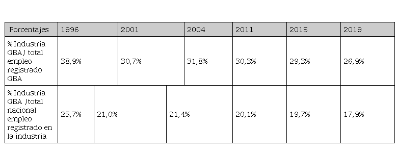 Del mismo modo, el conjunto de los partidos del Gran Buenos Airesconcentra cerca del 27% del empleo registrado de la industria manufacturera de todo el país, siendo una de las zonas más importantes en términos de la participación del empleo industrial dentro del total del empleo formal del sector privado. Sin embargo, atraviesa un proceso de declive paulatino –en relación al total del empleo registrado en el plano territorial y a nivel agregado en todo el país. La tabla 1 muestra la evolución de la participación del empleo industrial tanto en el plano de estos partidos como respecto al ámbito nacional. Puede verse así como en los últimos 25 años, la industria en esos partidos perdió cerca de 12 puntos porcentuales de participación respecto al total del empleo privado registrado, mientras que a nivel nacional la caída fue de unos 8 puntos.