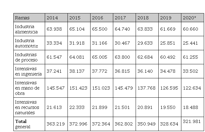Para el primer semestre de 2020, los datos provisorios de la misma fuente arrojan casi 322 mil empleos industriales. En la tabla 2 se presenta la evolución del empleo manufacturero entre 2014 y 2020, por grupos de ramas industriales.