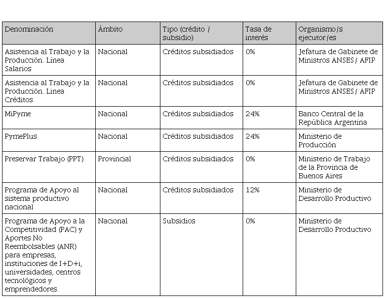 Estas acciones se encuadrarían posteriormente en el Programa de Asistencia de Emergencias al Trabajo y la Producción (ATP). En el marco de este programa el Estado nacional cubre parte del salario de los trabajadores privados en relación de dependencia en empresas afectadas por la caída de la actividad económica. También se incrementa el monto del seguro de desempleo, se otorgan créditos a tasa cero a autónomos y monotributistas, y se establecen a prórrogas y reducciones de hasta 95% de las contribuciones patronales. A ello se sumarían, también, créditos subsidiados a empresas PyMEs y la ampliación de la cobertura social y previsional, junto al Ingreso Familiar de Emergencia (IFE), mediante el pago de un bono a casi 9 millones de personas orientado a trabajadoras y trabajadores informales o desempleados. Posteriormente, a partir del DISPO con una apertura gradual de actividades se empezaron a desplegar nuevos instrumentos vinculados a comercio exterior y apoyo competitivo de las empresas.