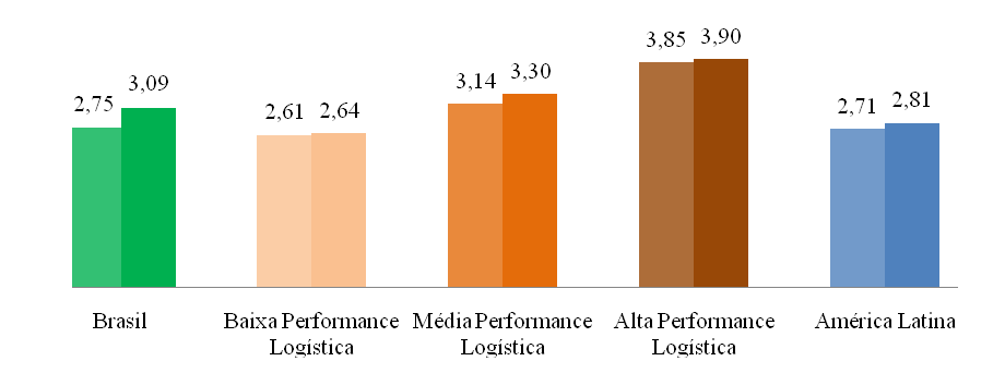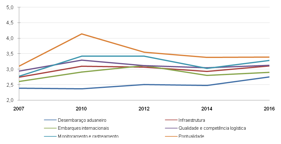 Já os indicadores de monitoramento e rastreamento e pontualidade se configuram nos dois maiores impulsionadores do desempenho logístico no Brasil, especialmente o índice de pontualidade, que atingiu uma pontuação de 3,39 em 2016. Ainda que tenha ultrapassado a barreira dos quatro pontos em 2010, a queda observada no indicador de pontualidade nos últimos seis anos já era esperada. Conforme Faria, Souza e Vieira (2015), uma das razões para esta pontuação se deve ao fato de que os parceiros comerciais já estão acostumados com a má infraestrutura e com o lento desembaraço alfandegário no País, já incorporando em suas expectativas um prazo adicional de entrega de mercadorias advindas do Brasil. Isto é, o indicador ‘pontualidade’ pode não refletir exatamente a eficiência logística brasileira, mas, sim, aspectos negociais.