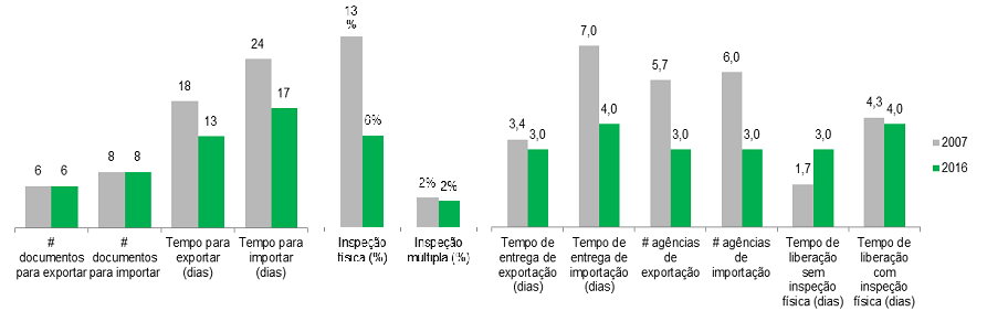 O Gráfico 3 revela dados importantes sobre o panorama logístico brasileiro, mais especificamente aduaneiro. O número de documentos necessários para exportação e importação (6 e 8, respectivamente), no Brasil, mantiveram-se constantes nos últimos anos, ainda que o tempo para importar e exportar (em sua totalidade e no período de entrega) tenha encurtado significativamente no período. Além disso, o número de agências reguladoras de exportação e importação foi reduzido para apenas três em 2016, algo que deve ter efeitos de médio ou longo prazo sobre a competitividade comercial brasileira, reduzindo, principalmente, entraves de ordem burocrática. Quanto ao tempo de liberação das cargas, ainda que este sem inspeção física tenha aumentado – talvez justamente por motivos burocráticos –, o período com a inspeção reduziu, o que pode ser explicado pela diminuição do percentual de cargas inspecionadas (de 13% para 6%).