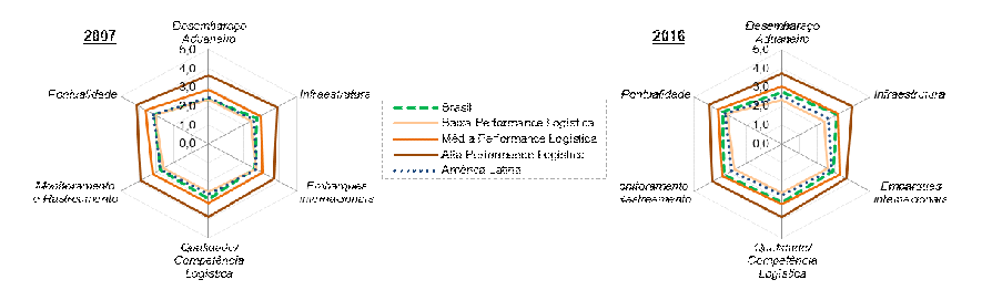 O presente artigo destinou-se a diagnosticar, a partir de dados do Banco Mundial, o desempenho logístico brasileiro na última década, identificando, por uma perspectiva multidimensional, os principais obstáculos para o desenvolvimento da logística de comércio exterior. Observou-se que, apesar do Brasil ocupar no ranking mundial uma posição abaixo de outros países de menor expressividade e de menor disponibilidade de recursos econômicos, o LPI brasileiro vem apresentando uma leve evolução entre 2007 e 2016. Mais especificamente, o indicador está se aproximando da média encontrada para o grupo de médio desempenho logístico, formado por países que, segundo Faria, Souza e Vieira (2015), são os concorrentes diretos na atividade exportadora brasileira, como Argentina, Chile e África do Sul.