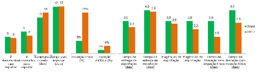 Assim como o Gráfico 3, o Gráfico 6 permite correlações entre as variáveis que ocasionam algumas constatações importantes para melhor situar o Brasil, estrategicamente, no meio internacional. Primeiramente, nota-se que os documentos e agências regulatórias de exportação e importação são mais numerosos no Brasil, comparativamente ao GMDL, um indicativo de maiores entraves burocráticos. De mais a mais, o tempo médio de exportação e importação (seja total ou somente tangente ao período de entrega) é muito similar entre o Brasil e seus principais competidores. Por fim, observando em conjunto as variáveis relacionais à inspeção e à liberação das cargas, é possível obter uma conclusão alarmante. Ainda que o percentual de inspeção física e múltipla no Brasil seja inferior àquela dos países componentes do GMDL, o tempo de liberação com e sem inspeção física é maior, fato que contraria a expectativa. Sendo assim, tais constatações acentuam os problemas de burocracia, eficiência aduaneira e custos logísticos - já diagnosticados anteriormente.