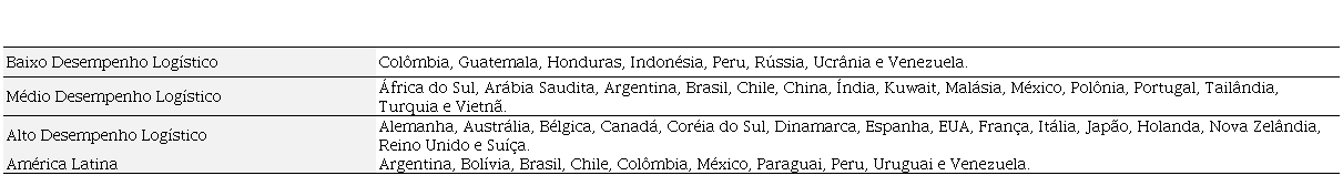 Para tanto, foram selecionados quatro grupos de países: além dos três clusters selecionados por Faria, Souza e Vieira (2015) (países de alto, médio e baixo desempenho logístico), também se incorporou um cluster formado pelas principais economias da América Latina, para se estabelecer uma comparação das nações mais próximas geograficamente. Os clusters estão especificados no Quadro 2.