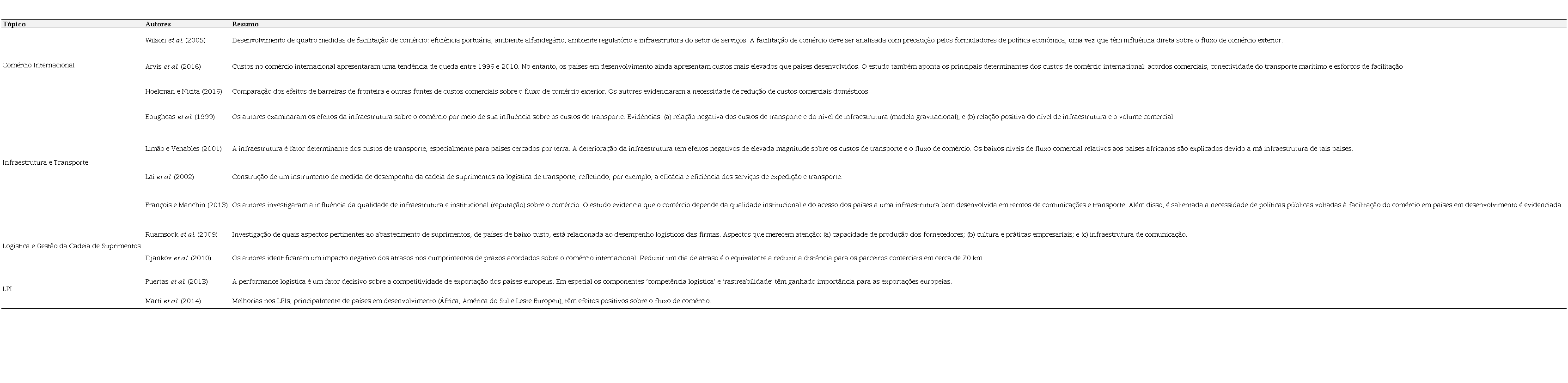Como se pode observar no Quadro 1, além da importância da mensuração e da comparação de aspectos logísticos, a literatura se preocupou em evidenciar a associação entre a competitividade no comércio exterior e os fatores como a eficiência alfandegária, o cumprimento de prazos, a redução de custos de transportes e a maior qualidade de infraestrutura de comunicações.