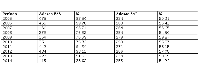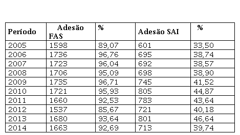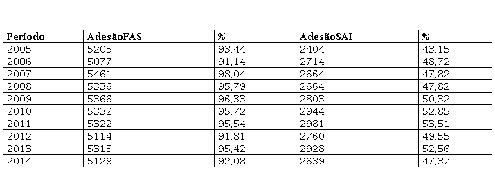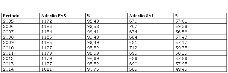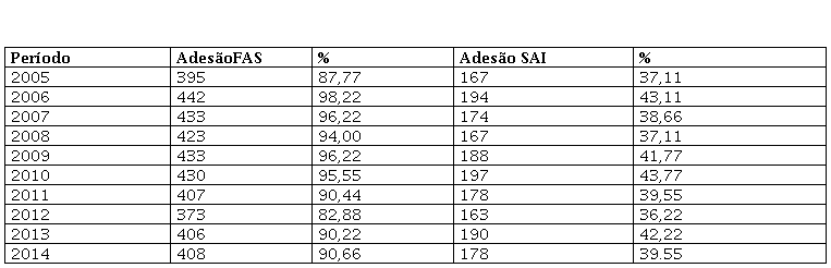 Quando comparamos os resultados da Tabela 3 com a Tabela 1, verifica-se equilíbrio dos municípios da região Nordeste entre sua adesão e a adesão à FAS com o índice nacional. Em relação à SAI, quando comparada ao índice nacional, verificou-se compatibilidade entre os resultados da região Nordeste com a região Norte, visto que existiu baixa adesão à SAI de 2005 a 2008 e no ano de 2014.