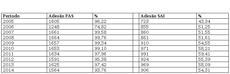 Quando comparamos o percentual de adesão à FAS dos municípios da região Sul com os índices nacionais, observamos taxas significativamente altas, próximas a 100%. Em relação à adesão dos municípios sulistas à SAI, verificou-se compatibilidade com os índices nacionais (Tabela 1), uma vez que os valores atestaram para casa dos 50%, com exceção do ano de 2014, que foi levemente inferior: 49,45%.