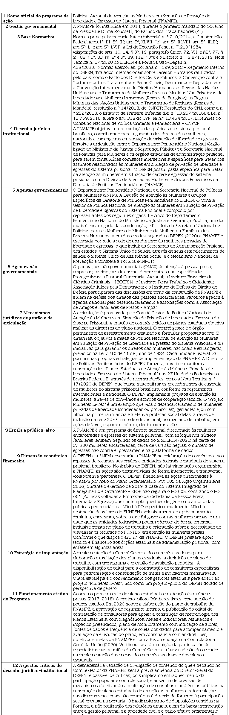 A abordagem Direito e Políticas Públicas (DPP) revelou-se apta a proporcionar uma representação do programa de ação da Política Nacional em Atenção às Mulheres Presas e Egressas (PNAMPE), além da identificação de seus principais elementos, tornando viável o estudo da organização interna da referida política, vez que a investigação resultou no diagnóstico de pontos críticos relacionados aos elementos importantes do programa, como o descumprimento das disposições previstas na sua base normativa, considerando que dificuldades relatadas foram identificadas através da elaboração do quadro analítico, a partir da aplicação da abordagem DPP.
