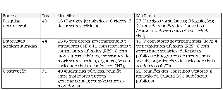 De cunho interpretativo e crítico (GUBA; LINCOLN, 1994), esta pesquisa adotou a construção de estudos de caso em profundidade como estratégia metodológica. Foram analisados dois estudos de caso relativos à remoção de moradores devido à implementação de políticas urbanas (MARQUES, 2018), escolhidos pelo potencial de aprendizados relacionados à formação da arena pública e pela possibilidade de acompanhamento in loco. Os dois casos foram acompanhados por um período de 18 meses, entre maio de 2017 e novembro de 2018, resultando na base de material empírico apresentada na tabela 1.