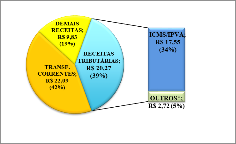 Do total bruto arrecadado de R$ 52,19 bilhões, R$ 22,09 bilhões referem-se às receitas de transferências correntes, R$ 20,27 bilhões às receitas tributárias e R$ 9,83 bilhões às demais receitas, conforme o Gráfico 1.