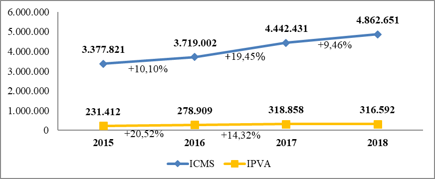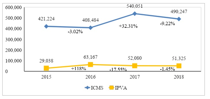 Já a arrecadação com o IPVA, o governo estadual realizou receitas na ordem de R$ 231,41 milhões em 2015, R$ 278,90 milhões em 2016, R$ 318,85 milhões em 2017 e R$ 316,59 milhões em 2018, um crescimento de 36,81% no período 2015-2018. No entanto, quando analisado ano a ano, as receitas de IPVA cresceram 20,52% em 2016 comparado com 2015, 14,32% em 2017 e -0,71% em 2018. Desta forma, a receita de IPVA teve seu crescimento desacelerado até 2017 e recuou em 2018 quando comparado com o ano anterior.
