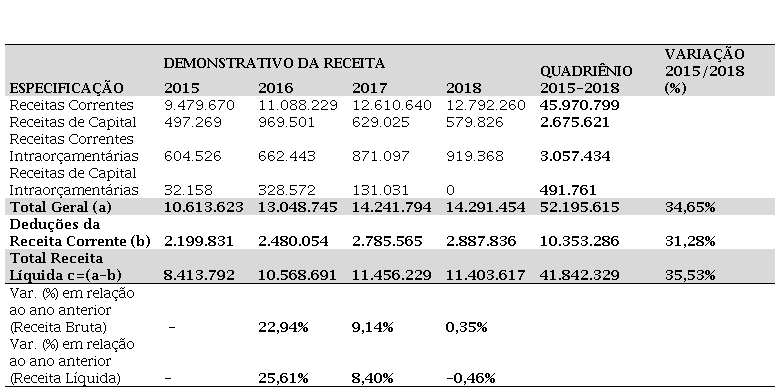 Apesar de a receita bruta arrecadada ter expandido 34,65%, a taxa de crescimento das receitas do Estado do Piauí vem sendo reduzida ano após ano: em 2016, o crescimento em relação ao ano anterior foi de 22,94%; em 2017, foi de 9,14% e em 2018, foi de apenas 0,35%, conforme tabela 01, o que evidenciou uma forte desaceleração no crescimento das receitas estaduais no período 2015-2018.