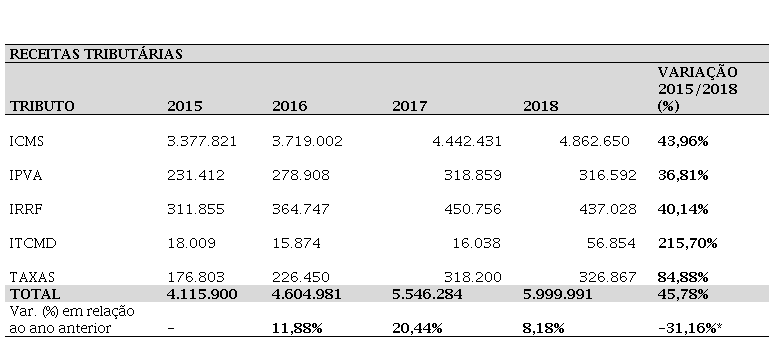 Somando o montante dos impostos com o ICMS e o IPVA, o governo estadual arrecadou receita no valor de R$ 3,60 bilhões em 2015, R$ 3,99 bilhões em 2016, R$ 4,76 bilhões em 2017 e R$ 5,17 bilhões em 2018, um crescimento 43,5% no período analisado, conforme Tabela 3.