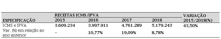 Quando analisado ano a ano, o crescimento do ICMS foi de 10,10% em 2016, 19,45% em 2017 e 9,46% em 2018. Ao longo do período analisado, a receita de ICMS sofreu uma desaceleração no seu crescimento, principalmente, no biênio 2017-2018.
