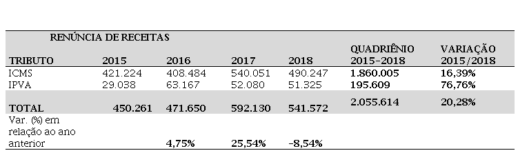 O montante de receitas renunciadas foi R$ 450,26 milhões em 2015, R$ 421,2 milhões em ICMS e R$ 29 milhões em IPVA; R$ 471,65 milhões em 2016, R$ 408,4 milhões em ICMS e R$ 63,1 milhões em IPVA; R$ 592,1 milhões em 2017, R$ 540 milhões em ICMS e R$ 52 milhões em IPVA; e R$ 541,5 milhões em 2018, R$ 490,2 milhões em ICMS e R$ 51,3 milhões em IPVA, conforme Tabela 4.