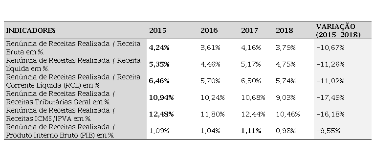 A análise da relevância das renúncias tributárias na formação do fundo público estadual passou pela análise de indicadores que mediram a representatividade das renúncias de receitas realizadas ao longo de 2015-2018, em relação às variáveis: receita bruta, receita líquida, receita corrente líquida (RCL), receita tributária e receita de impostos (ICMS e IPVA) e o PIB, conforme apresentado na Tabela 5.