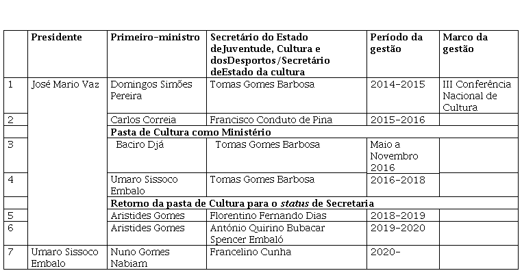 Logo que o PAIGC assumiu o governo, em 2014, a Secretaria do Estado de Juventude, Cultura e dos Desportos iniciou as ações voltadas ao setor cultural. Nos documentos analisados, marcos importantes podem ser notados no que tange ao estabelecimento de ações que visavam articular políticas culturais no país, exemplo da realização da III Conferência Nacional de Cultura em 2015; como apontado, as intenções de impulsionar o desenvolvimento do setor cultural eram evidentes. Outros interesses são percebidos nos gestores culturais (secretários) que passaram, mesmo com pouco tempo de duração na gestão; como no caso do estímulo à qualificação dos agentes culturais/profissionais; da construção de equipamentos culturais, de infraestruturas, que viabilizem os trabalhos dos grupos e às manifestações artístico-culturais; também na intenção de promover debate público participativo para debruçar-se sobre o futuro do setor cultural.