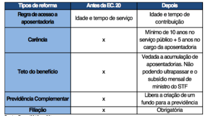 Por meio da EC 20/1998, objetivou-se a aproximação entre os Regimes Próprio e o Regime Geral de Previdência Social (RGPS e RPPS), sendo alterados o tempo de contribuição e o tardamento no acesso à aposentadoria para os trabalhadores junto à aprovação de um teto ao Regime Geral. Foi propalada a possibilidade de implantação da previdência complementar aos servidores públicos conforme diretrizes estabelecidas nos parágrafos 14 e 15 do artigo 40 da Reforma. As principais mudanças podem ser vistas nas Figuras 1 e 2.