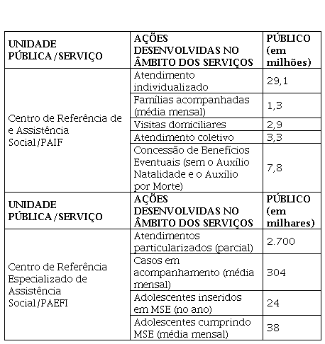 Apesar da formatação da lógica integrada e territorializada do SUAS, a sua implementação tem sido marcada pela descontinuidade, com aportes minimalistas nas ofertas de serviços, tanto na Proteção Social Básica, para a atendimento às situações de vulnerabilidade social, quanto na Proteção Social Especial de Média e Alta Complexidade, para atendimento às situações de risco ou violação de direitos, respectivamente, dentro e fora do núcleo familiar de origem.