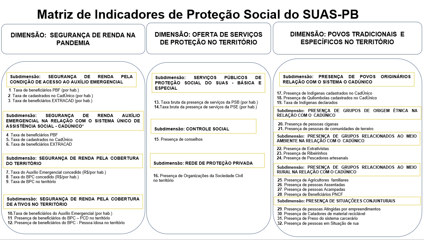 Para o delineamento desse texto, o Sistema Único de Assistência Social (SUAS), ocupou sua centralidade na perspectiva de elucidar o debate da crise sociossanitária vigente e seus impactos no sistema de proteção social brasileiro, à luz da observação do Estado da Paraíba, construída em escala municipal para os seus 223 municípios. Essa visibilidade dá-se a partir de uma coletânea de indicadores em suas expressões territoriais, sensíveis a desigualdades de acesso a ativos de proteção social, aqui traduzidos em programas, serviços e benefícios socioassistenciais no enfrentamento da Covid-19, o que resultou no escopo de um desenho de Matriz conceitual multidimensional formada por dimensões e subdimensões, as quais são representadas por um conjunto de indicadores mensuráveis. Assim, o delineamento investigativo partiu das seguintes premissas: