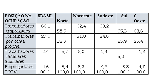 Importa destacar que a definição de informalidade utilizada na Síntese dos Indicadores sociais do IBGE (2020) é recomendada pela Organização Internacional do Trabalho (OIT) e inclui cinco modalidades de posição na ocupação: empregado no setor privado e no setor público sem carteira de trabalho assinada; trabalhador doméstico sem carteira de trabalho assinada; trabalhador por conta própria sem CNPJ e não contribuinte com a Previdência Social; empregador não contribuinte; e trabalhador familiar auxiliar.