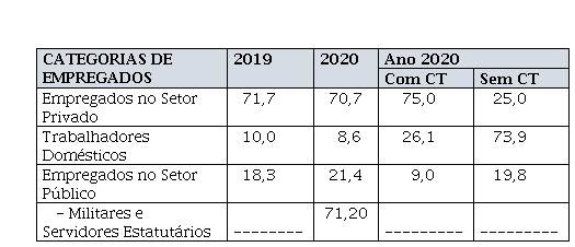 Os trabalhadores empregados são classificados pelo IBGE (2020), de acordo com o espaço de trabalho, em três diferentes categorias: os empregados no setor privado; os trabalhadores domésticos; e os empregados do setor público, incluindo os militares e os estatutários. Em 2019, o setor privado representava 71,7% dos empregados, mas com pandemia e ao final de 2020, ocorreu uma queda neste percentual e chegou a 70,0%. Entretanto, 25,0% desses trabalhadores empregados no setor privado não tinham carteira assinada, de modo que também estavam na informalidade. Porém, a renda dos trabalhadores do setor privado, com carteira assinada e a do setor público, permaneceu quase estável.