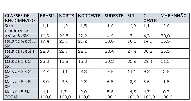 Conforme tabela abaixo, a desigualdade nas condições de renda aparece com mais evidência na Região Nordeste e no Estado do Maranhão, principalmente quando comparada à Região Sudeste e a Sul. No ano de 2019, no Nordeste, 23,7% das famílias sobreviviam sem nenhuma renda ou com até ¼ do salário-mínimo, como renda per capita, ou seja, em condição extrema pobreza. Na situação de pobreza, com até ½ salário-mínimo, estavam 25,2% das famílias. Somados esses dados de pobreza e de extrema pobreza estão nestas condições 48,9% das famílias nordestinas. Em 2019, dentre as grandes regiões brasileiras, as famílias do Nordeste sobreviveram com os maiores índices de indigência e de pobreza do país. Também neste ano, o Maranhão apresentou os piores índices de renda do país e da região: 58,5% das famílias viviam com apenas de ¼ ou até ½ salário-mínimo, ou seja: 32,0% das famílias estavam na linha de extrema pobreza e 26,5% na de pobreza. Com renda de até um salário-mínimo, estava um percentual menor, 25,5% das famílias maranhenses.