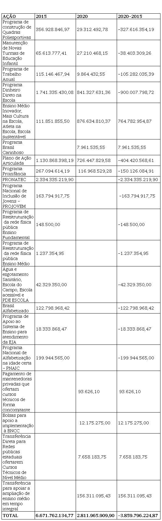 Observa-se que houve diminuição drástica de recursos em quase todos os programas, com apenas duas exceções, que foram o programa Brasil Carinhoso e as ações voltadas para o ensino médio inovador. No corte de recursos, chama atenção o valor de mais de 900 milhões a menos no Programa Dinheiro Direto na Escola, programa que é utilizado para transferência de recursos para as escolas fazerem pequenos serviços e adquirirem material didático e materiais de higiene e limpeza, que poderiam ter sido potencializados no contexto da pandemia. Cabe destacar que um total de oito programas deixaram de ser operacionalizados no ano de 2020, entre eles programas com foco em atendimento a segmentos sociais historicamente marcados pela exclusão educacional, a exemplo do Projovem, do atendimento à EJA, do Brasil alfabetizado e Escolas do campo. Por outro lado, observa-se quatro novas ações que foram objeto de transferência de recursos do governo federal, todas com foco nas políticas prioritárias do governo – o novo ensino médio, BNCC e ensino técnico, o que demonstra que em plena pandemia o governo federal aproveitou para influenciar estados e municípios na adoção de suas políticas.