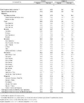 En Argentina la información de la Encuesta Permanente de Hogares (EPH) está disponible desde 1974 para el Gran Buenos Aires y desde comienzos de la década de los 90 para los principales centros urbanos del país. El análisis de dicha información indica que la pobreza aumentó considerablemente durante los años 80 alcanzando un máximo del 42% en 1990. Disminuyó a comienzos de los 90 alcanzando un mínimo cercano al 19% a fines de 1993 para después ascender continuamente hasta un máximo histórico del 58% en el 2002. Con la recuperación económica la pobreza ha caído sensiblemente estimándose su valor en un 26,9% a fines del 2006. El comportamiento de Argentina contrasta con lo sucedido en la región de América Latina y el Caribe donde se estima que la pobreza se habría reducido en promedio en 3 puntos porcentuales entre principios de los 90 y fines del 2005 (MILLÁN-SMITMANS, 2008, p. 2).