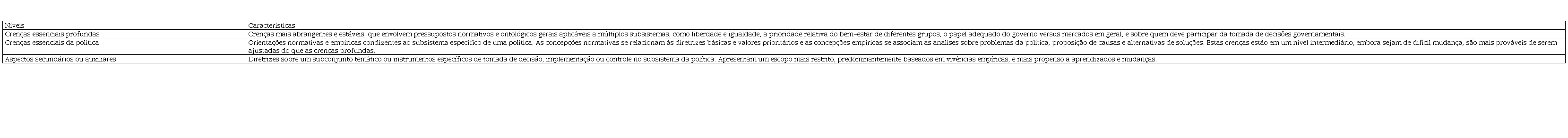 De acordo com Cairney (2015), na interação entre as coalizões de defesa concorrentes de um subsistema político existe o compartilhamento de um conjunto de crenças, que funcionam como um tipo de ‘cola’ que os mantêm unidos e podem se basear em uma estrutura hierárquica formada por três níveis (SABATIER; WEIBLE, 2007; CAIRNEY, 2015, VICENTE, 2015), conforme quadro 1: