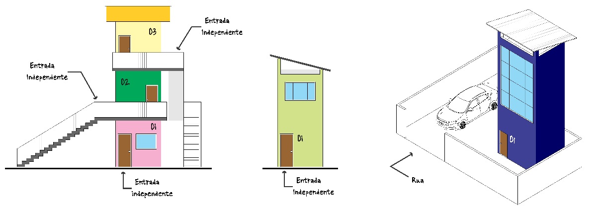 Observa-se, pela Figura 1, que o primeiro exemplo, da esquerda para a direita, caracteriza uma situação na qual é possível a instituição do direito real de laje, visto que os três pavimentos existentes no imóvel possuem acesso autônomo e independente às vias públicas, de modo que o acesso de um não interfere no acesso do outro. Por outro lado, os demais exemplos caracterizam situações nas quais não é possível reconhecer o enquadramento do direito real de laje, tendo em vista que as edificações possuem mais de um pavimento e apenas um acesso, de forma que, os moradores do pavimento superior só têm acesso à via pública se passar, necessariamente, pelo pavimento inferior.