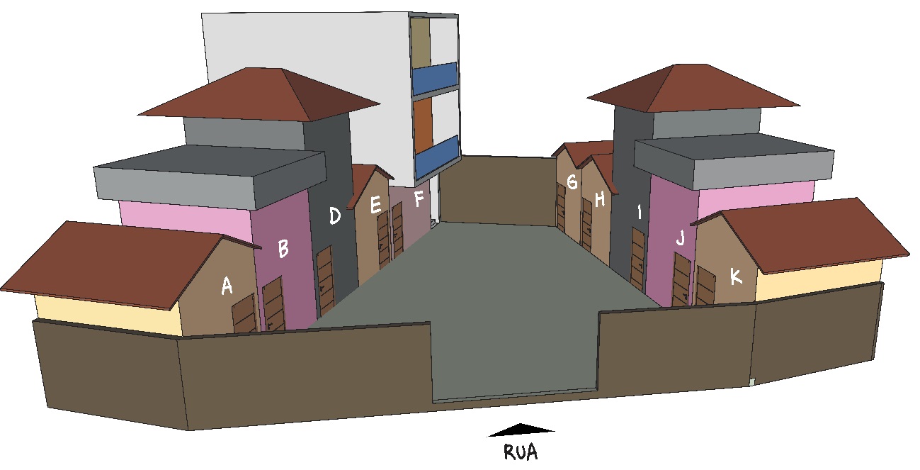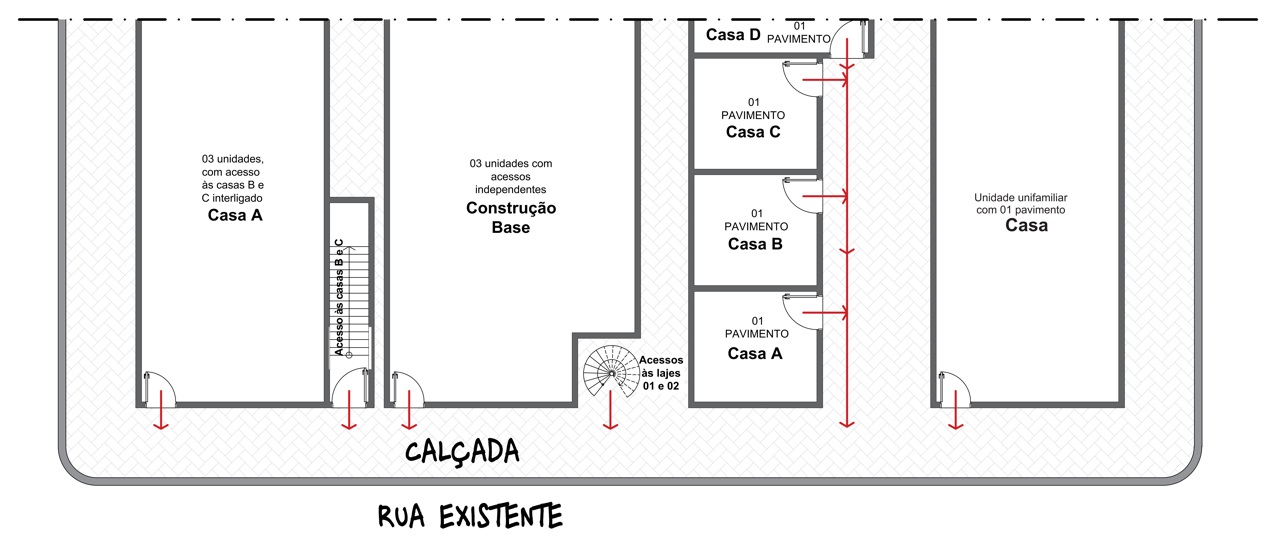 Conforme se percebe, o imóvel A possui 03 unidades residenciais com acesso interligado – via escada, uma vez que se trata de residências sobrepostas – às casas B e C. A Construção Base (o segundo lote) se constitui de 03 unidades com acessos independentes, sendo o acesso da Construção Base direto, e o acesso das lajes 01 e 02 via escada. O terceiro lote possui 4 unidades residenciais autônomas (Casa A, Casa B, Casa C e Casa D) cujo acesso à via pública é compartilhado. Por fim, o quarto lote (Casa) se trata de uma unidade unifamiliar (Lote 4, Figura 04) com 03 pavimentos e acesso à via pública compartilhado.