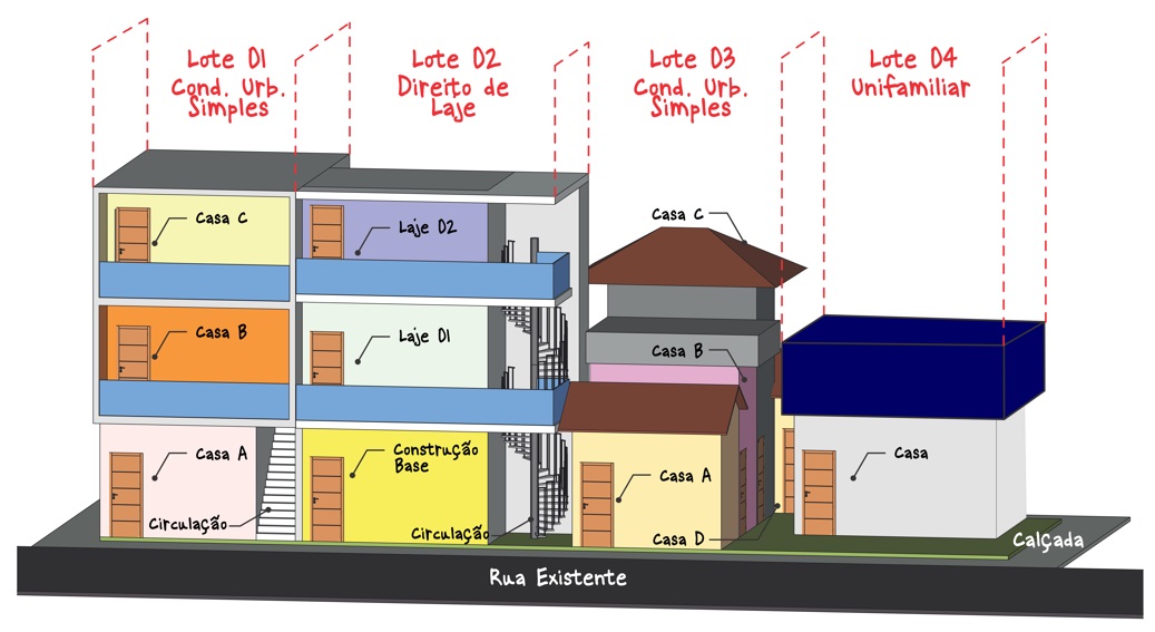 A Figura 4 ilustra as distinções entre o Condomínio Urbano Simples e o Direito de Laje por meio de uma planta com vista superior em 2 dimensões. Como se percebe, é possível que se tenha diversas tipologias de lotes em um mesmo núcleo urbano informal.
